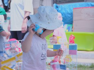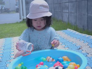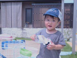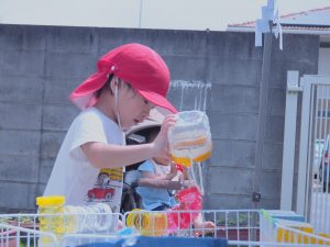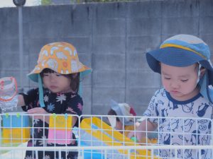 自分で水を頭からかけたり、水鉄砲でかけあいをしたりと水に触れながら、思い思いに楽しみました。