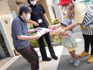 また、9月16日には、敬老の日のプレゼントを渡すために1歳児りす組と2歳児うさぎ組の子どもたちは小規模多機能ホーム庄の里「つどいの家」に行ってきました。各クラスの制作を貼り付けたカレンダーを渡すと、とても喜んでいただけて子どもたちも嬉しそうでした(^^♪