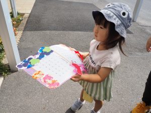 また、9月16日には、敬老の日のプレゼントを渡すために1歳児りす組と2歳児うさぎ組の子どもたちは小規模多機能ホーム庄の里「つどいの家」に行ってきました。各クラスの制作を貼り付けたカレンダーを渡すと、とても喜んでいただけて子どもたちも嬉しそうでした(^^♪