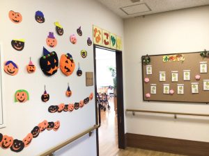 デイサービスの入り口やフロアが秋らしくなってきました。
