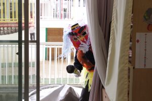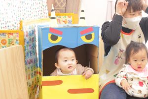 コーナー遊びを楽しんでいると追い出したはずの鬼が・・・鬼に向かって「鬼はそと!」とボールー投げて鬼退治!!