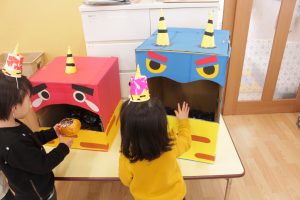 2月3日に豆まき会を行いました。『おなかのなかにおにがいる』の絵本を見ながら節分の意味を知った子どもたち!