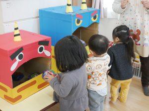 泣き虫鬼、怒りんぼう鬼の大きな口に玉を入れたり、風船の鬼にボールを投げたりして鬼を追い出しました!(^^)!