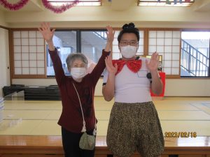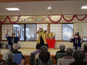 歌に合わせて、職員が考えた振り付けを、ご利用者様全員で踊りました。その後、ジェスチャーゲームで、おおいに盛り上がりました。栄養士の手作りケーキを食され、「美味しかった~」と笑顔が一杯です。