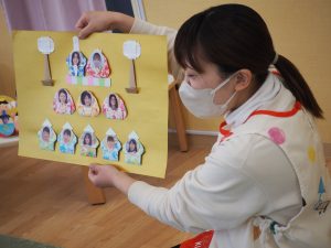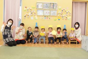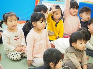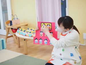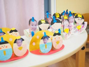 3月3日にひな祭り会を行いました。ひな祭りの由来を聞いたり保育園用に作られた先生たちのお雛様を見たりして、行事に興味をもった子どもたち(^^♪