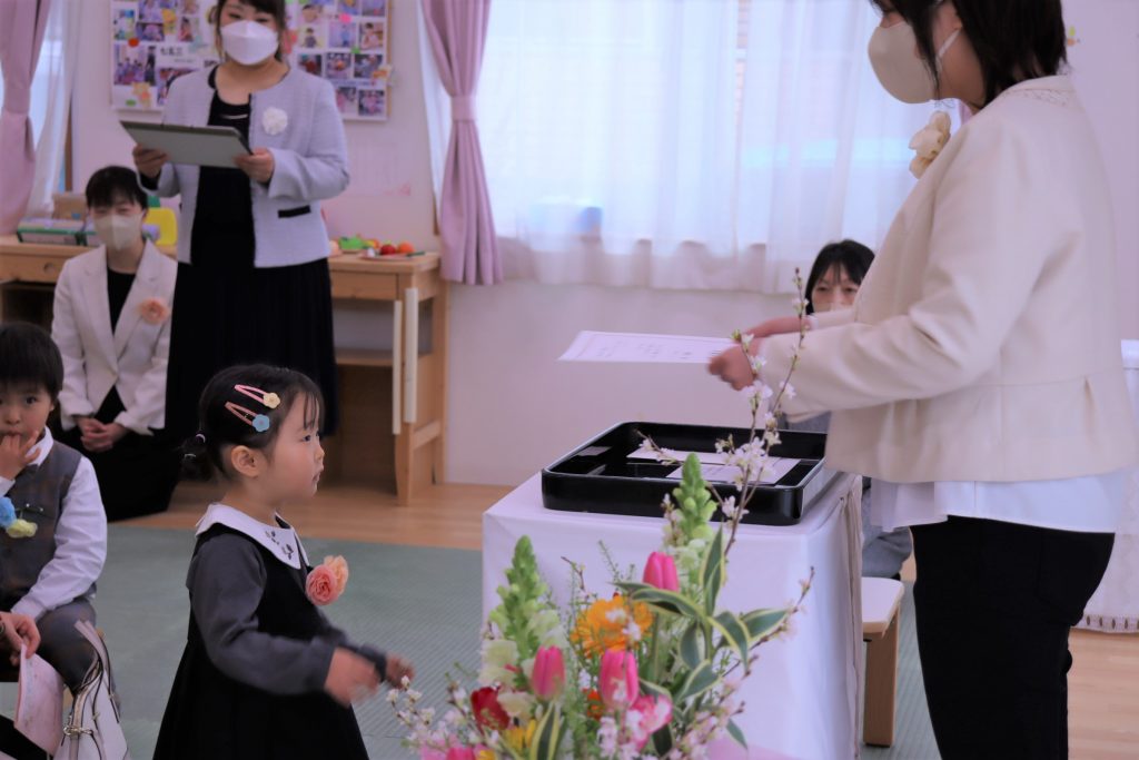 3月18日㈯に令和4年度の卒園式を行いました。名前を呼ばれるとひとりずつ前に出て、卒園証書を受けっとった子どもたち!2歳児とは思えないくらい堂々としていて立派でしたよ(*^-^*)