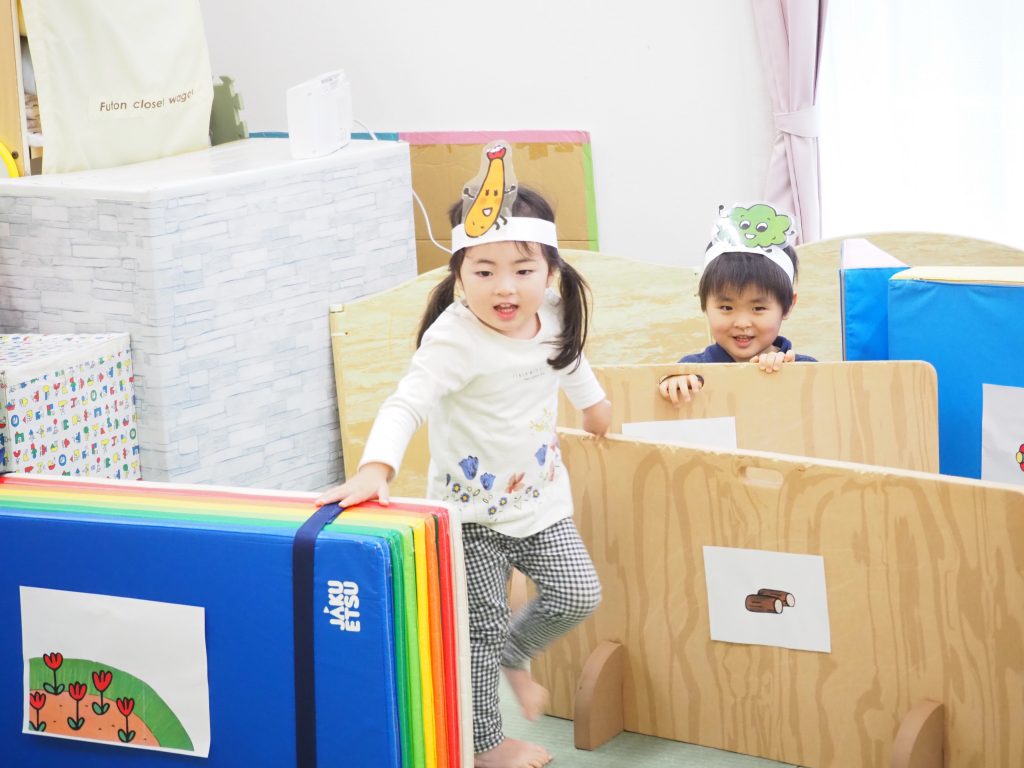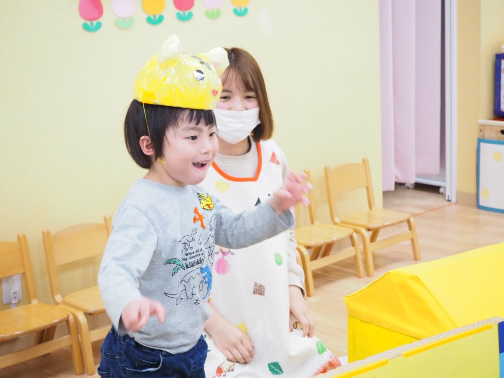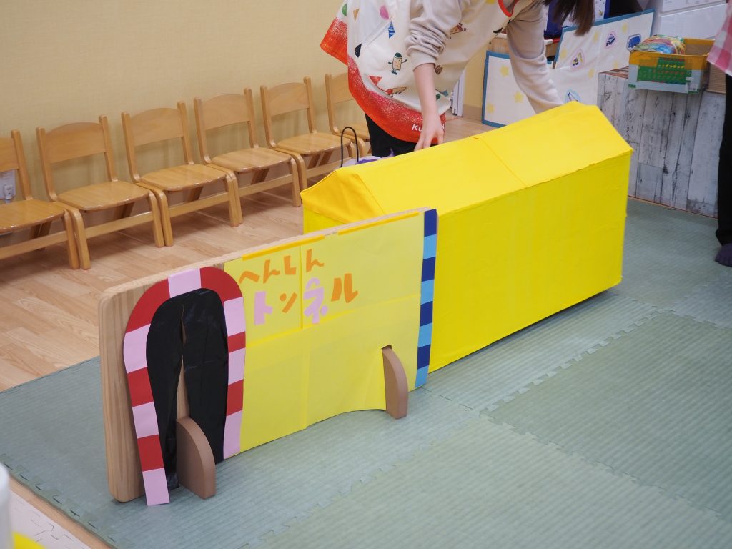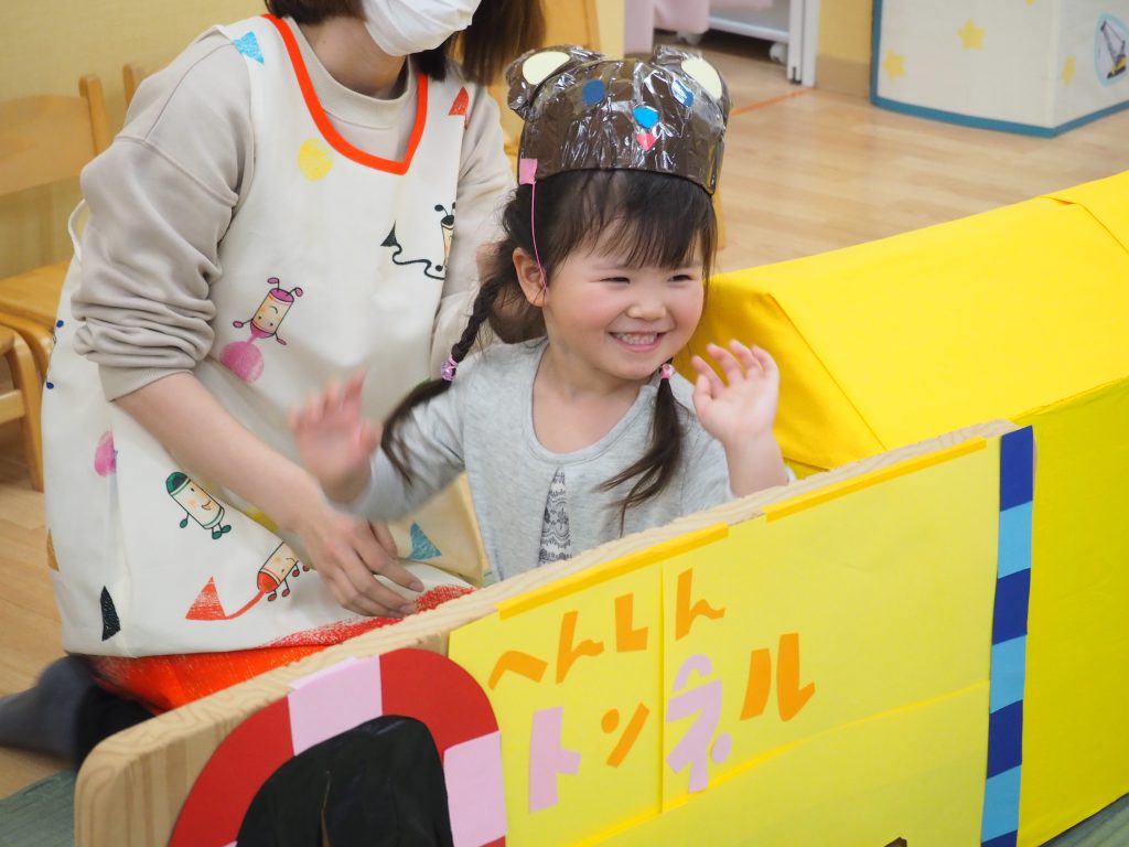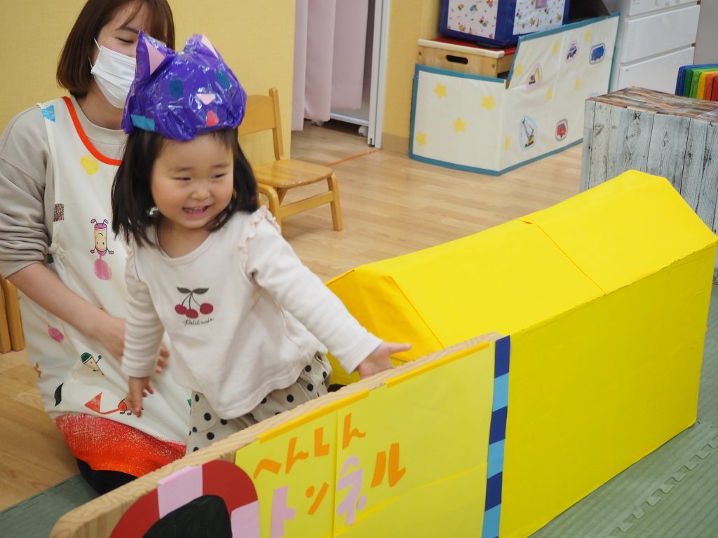 また、3月23日㈭に今年度最後の行事として、2歳児うさぎ組さんのお別れ会をしました。みんなが好きな『へんしんトンネル』のシアターを見た後、子どもたちが実際にへんしんトンネルを通ってみると・・・ビックリ!!かわいい動物たちに変身です(=^・^=)