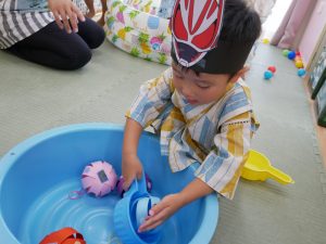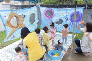 園庭には海の生き物たちが🐬🐙!大きな穴に向かって水風船を上手に投げ入れていました。
