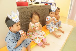 甚平やお気に入りの服で夏祭りを楽しみに登園してきた子どもたち。ちょうちんを飾りいつもとは違う保育室に、なにがはじまるんだろう~とワクワクしていました!