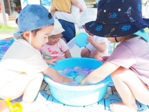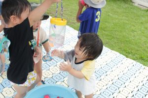 保育士や友達と水を掛け合ったり、水風船を割ったり、魚釣りや水鉄砲、、、