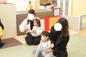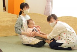 いつもは保育士とするわらべうたを、お母さんにしてもらって、にこにこ笑顔でした!