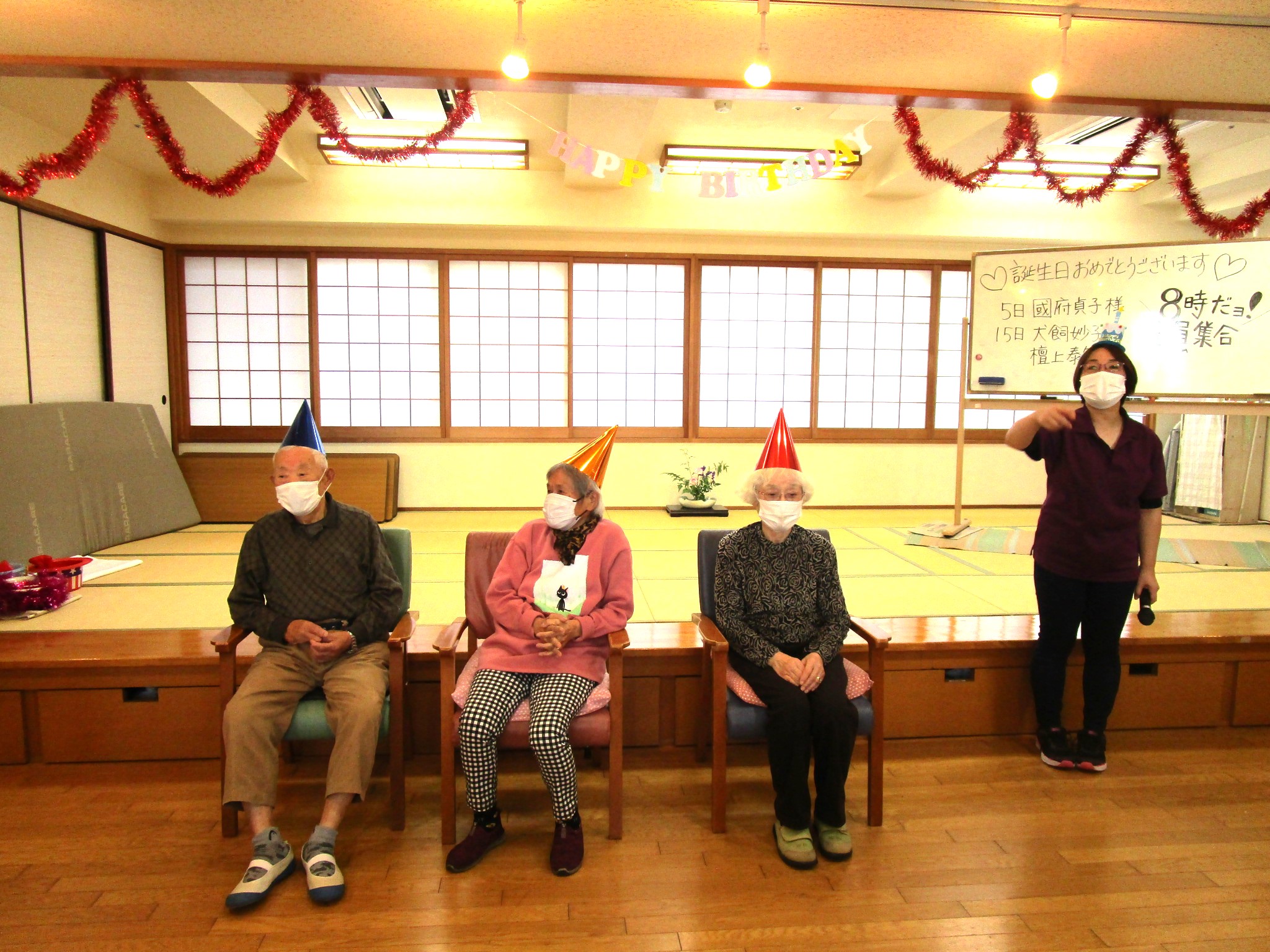 誕生日を迎えられた利用者様と一緒に、 懐かしのドリフのヒゲダンスを皆さんにご披露( ´∀` ) 続いて「階段上り下り」を…