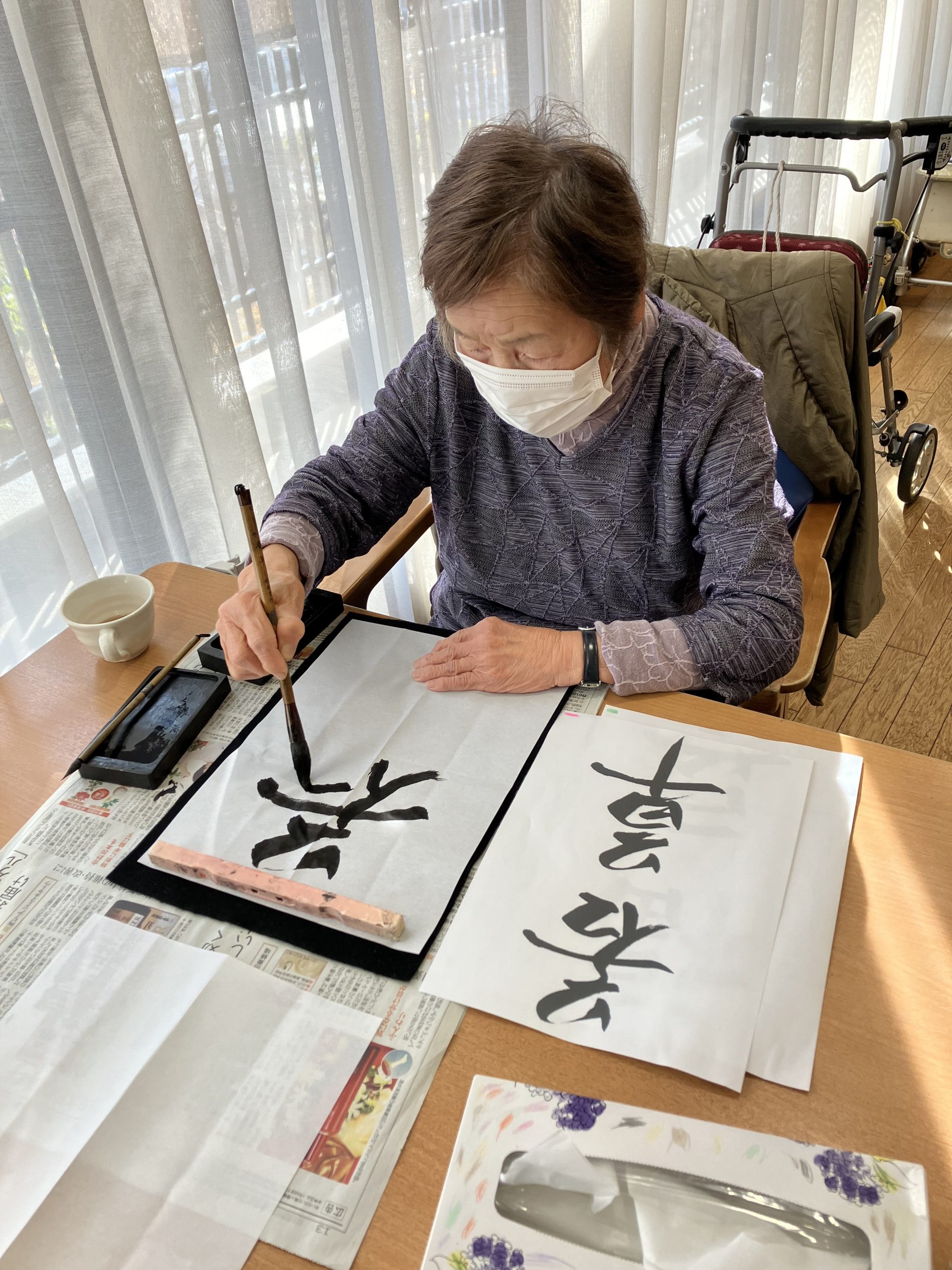 明けましておめでとうございます🌸 デイサービスでは新年初の書道を行いました(*^^*) 書き初めをしたいと大勢の方が参加…