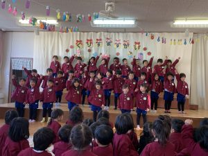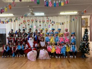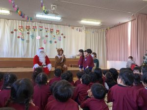 サンタさんとトナカイさんがたくさんのプレゼントを持ってきてくれました。質問タイムでは「サンタさんはどこでおもちゃを作ってるの?」「トナカイさんのそりはなんで飛ぶの?」など、子どもたちの質問に答えてもらいました。お礼に歌や踊りを披露して楽しい時間を過ごしました。
