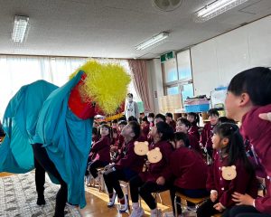 お正月の話を聞いて、福笑いやコマ回しなどの正月遊びを楽しんでいると、、、