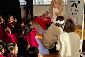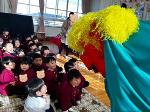 ししまいの登場にびっくりの子ども達。今年も幸せに無事過ごせるよう頭を噛んでもらいました。