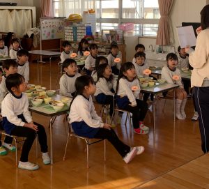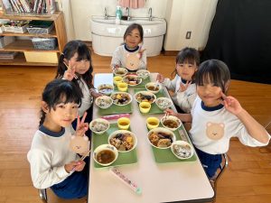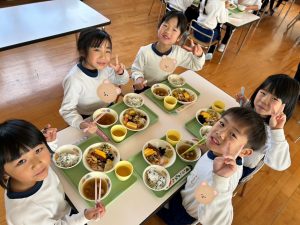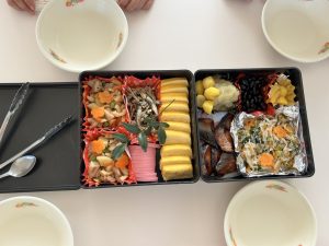 給食は豪華なおせち料理でした。すみれ組(5歳児)は給食の先生におせちの由来の話をしてもらい、お重にたくさん入ったおせちをおいしくいただきました。