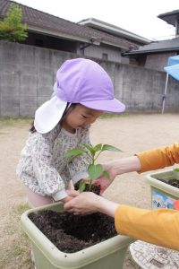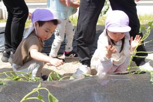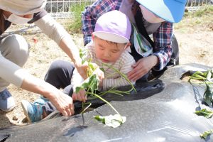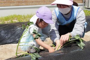 畑に行って、芋の苗を受け取ると、土の中に上手に植えることができました!