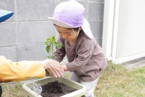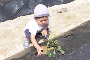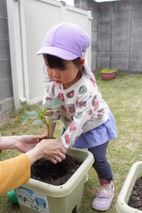 畑に行って、芋の苗を受け取ると、土の中に上手に植えることができました!