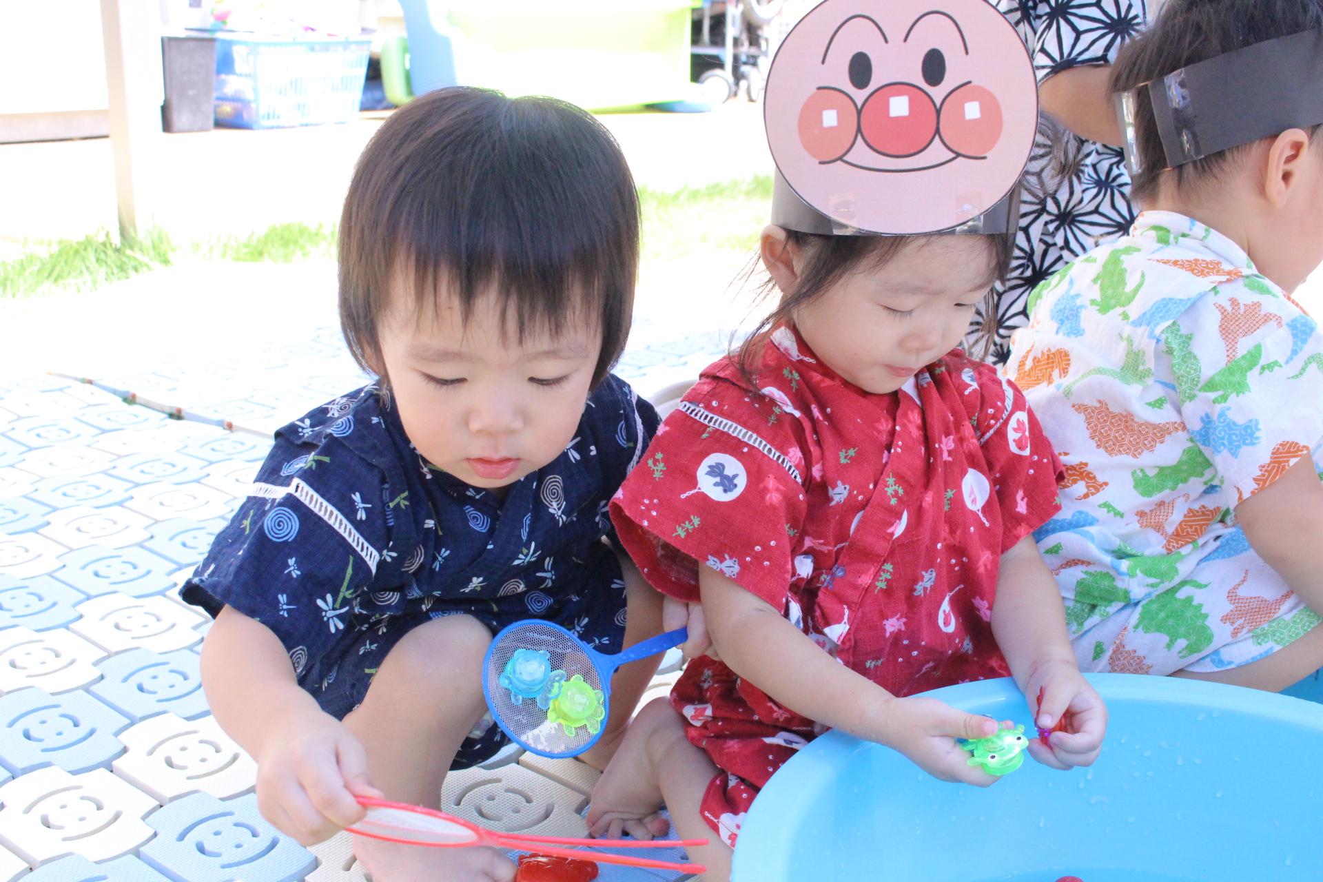 8月29日に夏祭りを行いました。甚平やお気に入りの服装で登園した子どもたちはいつもと違う雰囲気に大興奮! びっくりボ…