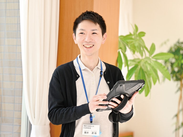 - 良かったなと感じることは、ご家族・ご入居者様から「困ったから藤井さんに相談した」と言っていただけた時です。今までの関わりで信頼関係を築く事が出来ていたんだと感じ、とても嬉しく自信にもつながります。